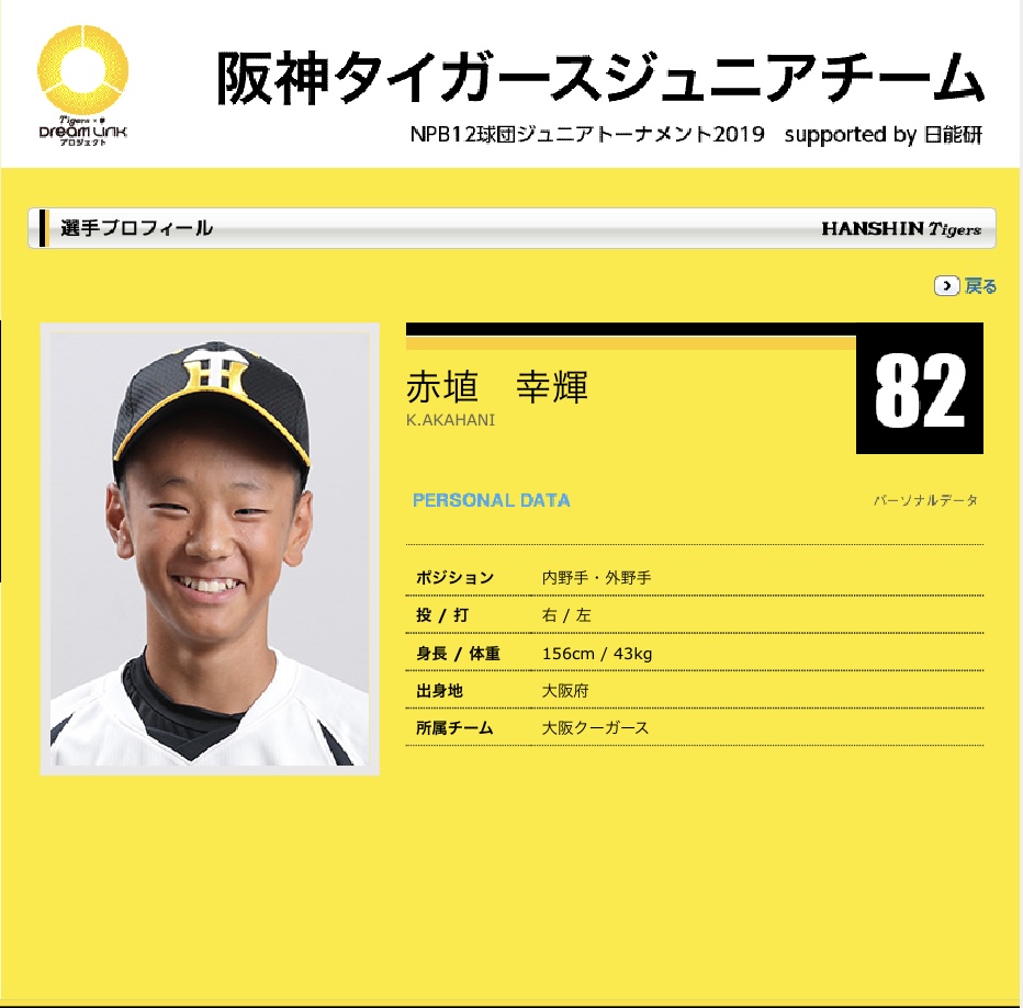 赤埴幸輝選手が阪神タイガースジュニアチームの時の写真がこちらです。