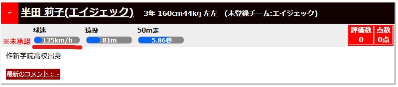 年齢関係なく、現役女子硬式野球選手としては社会人野球選手の半田莉子選手が135km/hの記録を出しています。