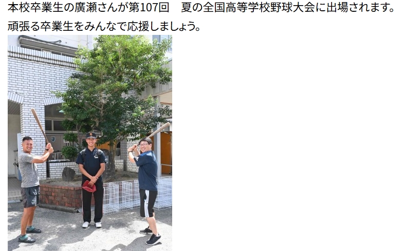 中学校のHPでは、広瀬賢汰さんの甲子園出場を応援する記事が載っていましたよ。